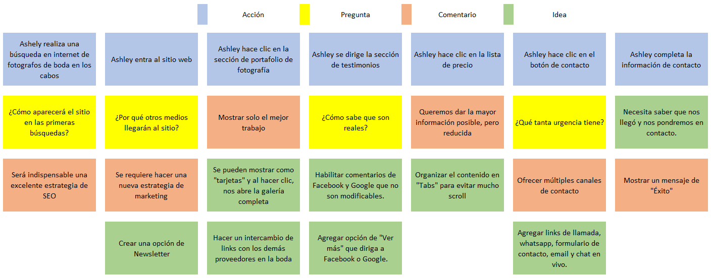 The following scenario helped find areas of opportunity, such as link-building SEO strategy with other wedding providers, Social Proof, multiple ways to contact the company, and prioritizing the content displayed to the users.
